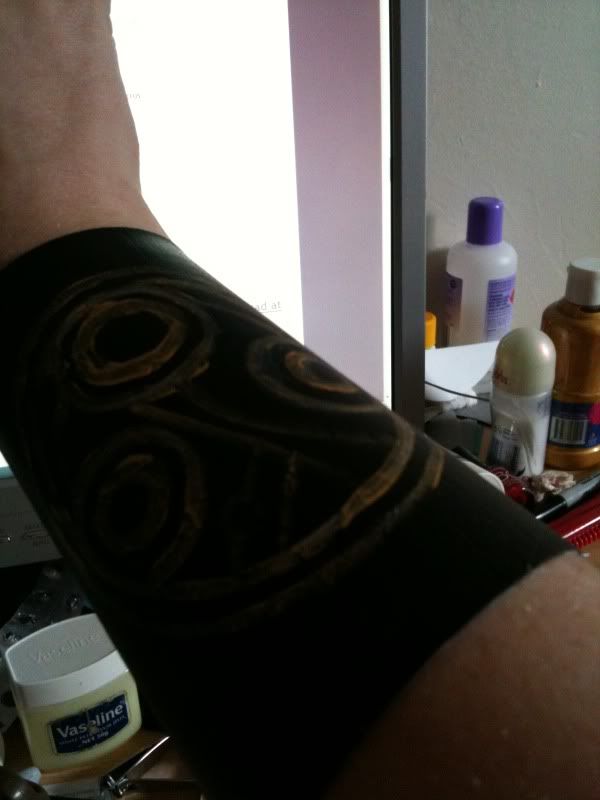 Sadly, I was kept from achieving True Awesome by the original seal of Rassilon, which is really buggering hard to turn into a handy stencil. New seal? Easy - I did it freehand in chalk on the gauntlets, and then went over it with gold paint. After three failed attempts to turn the original Seal into a stencil, I just got my last print-out, painted it gold, coloured the rest in with Sharpie, and stuck it to my corset with double-sided tape.