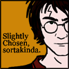 Description: Cartoon of Harry based on photos c.PoA movie on an orange-gold background with words, "Slightly Chosen, sortakinda".