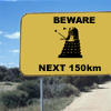 Description: An Australian landscape with a yellow road sign reading: BEWARE DALEKS NEXT 150 KM