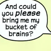 Description: Speech bubble from NextWave: "And could you PLEASE bring me my bucket of brains?"